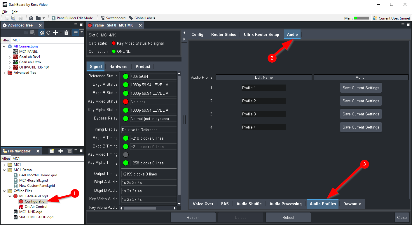 Audio Presets are configured in the Configuration menu. Select the "Configuration" node in the DashBoard Tree under the MC1-MK card. Then select Audio from the top tabs. Here you can name and capture the audio preset settings (including shuffle, downmix and gain). It will capture the settings currently setup on the selected Preset Bus crosspoint.