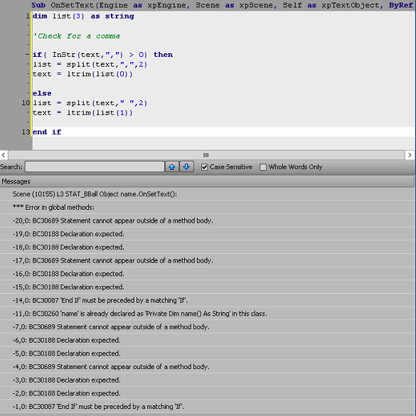 This is designed as two separate scripts to populate a firstname text object and a last name text object. If you want it all in one text box you'll need to combine the scripts and concatenate the results together.