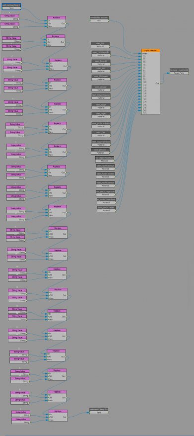 From text (A, B,C,D,E,F,G,H,I,J,K,L,M,N,O,P,Q,R,S,) to integer (1, 2, 3, 4, etc).And from integer (1, 2, 3, 4, etc). to material selector.
