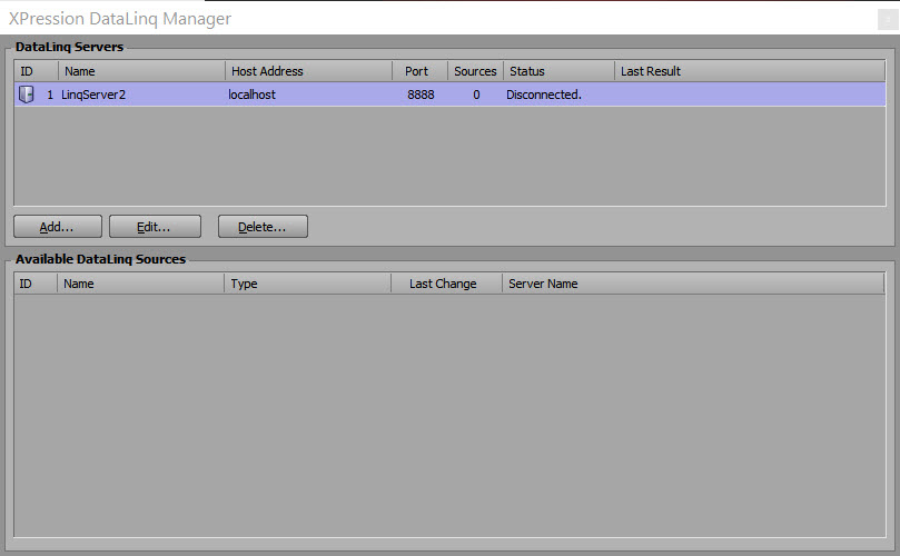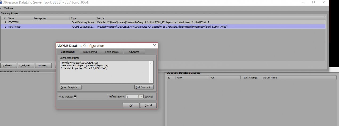 1.I followed the instructions on the Xpression U tut for datalinq. However, when I go to add the datalinq server in the manager, hit add and localhost and port is 8888 and hit ok, the server doesnt connect. I was able to get up to that point in the video but im stuck now. I am running 5.7 Build 3064. I would like to get this to work as i have a entire football team to set this up for and manually entering stats would kill me. Im connected to a excel source that successfully connected in the previous steps.