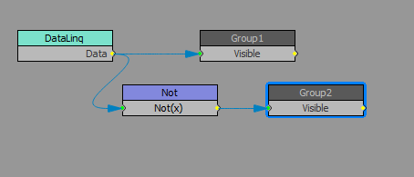 I have a setup that is EXACTLY as your picture #1 above, and it "works". When I set it up, I link it up with DataLinq, and the value is set to 0 (off) it hides the object.... However, when I then push "on" in DashBoard and try to send the value 1, it doesnt show back up. If I remove the DataLinq node and insert a new one, the object/group now shows up again as it should.