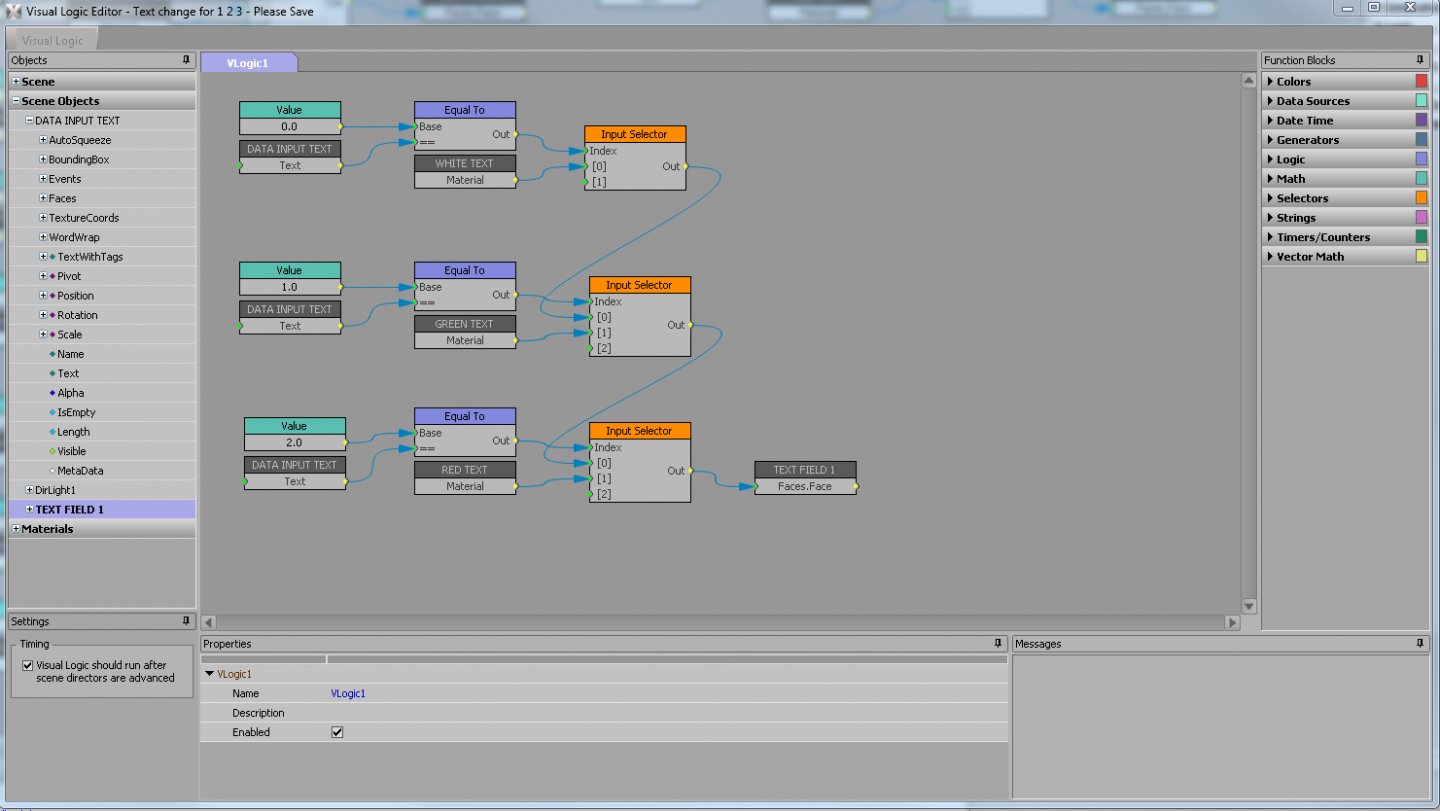 I am trying to use a data source (Data text 1) that gives me numbers of 1, 2 and 3 to change the color of a different text field (Text Field 1). For example, 0 = White text, 1 = Green text, 2 = Red text. I am trying to accomplish this through Visual Logic. Any thoughts?