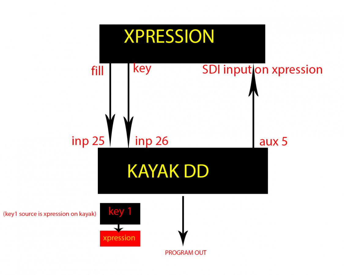My xpression connected Kayak DD switcher input.Also I control Xpressin on switcher with key button.And I connect an aux from switcher to Xpression SDI input.