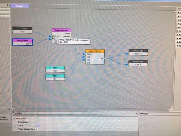 I am having issues getting a String Compare to "read" my String Value. My Text and String Value should be equal with a value of "TCU", but the string compare still reads the value as 0. I'm attempting to change a logo size based off of a certain text (TCU). I am very new to Visual Logic, and I have not found a work-around.