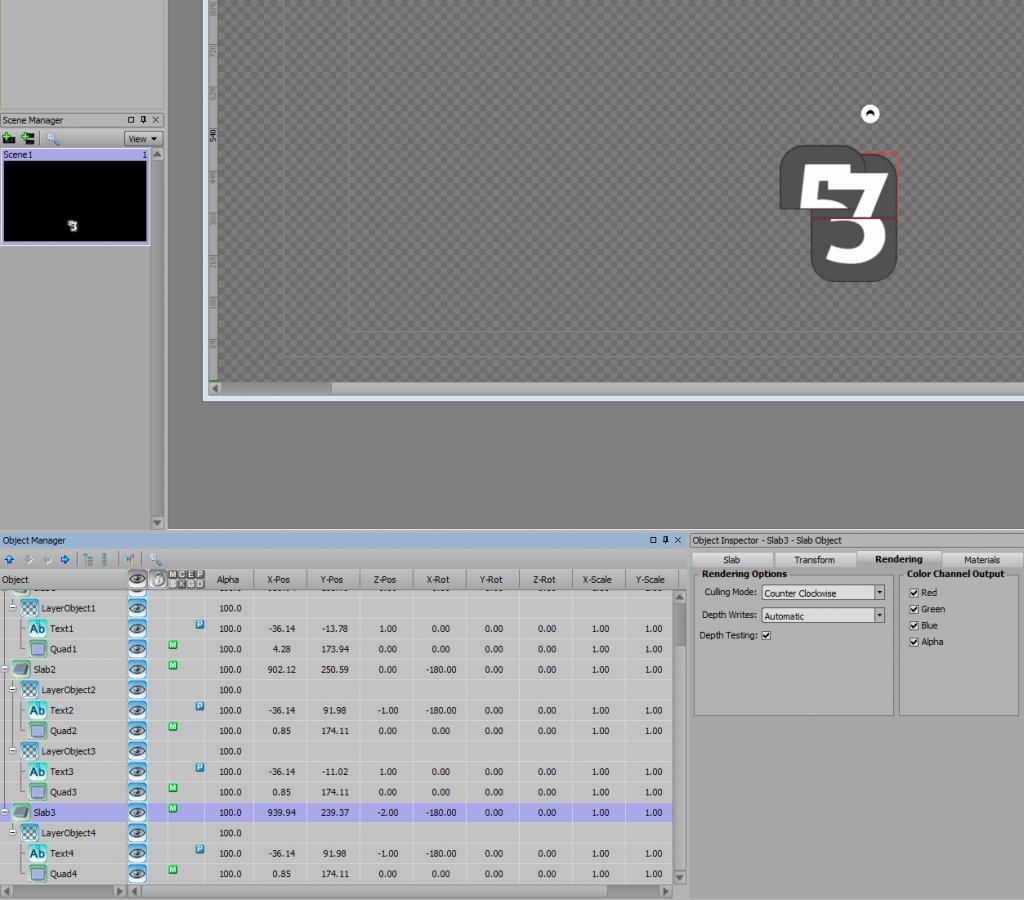 I'm trying to make a flip clock display style thing, so I've made 3D slabs, attached layer objects with masked 2D text items to them representing the top and bottom portions of clock.