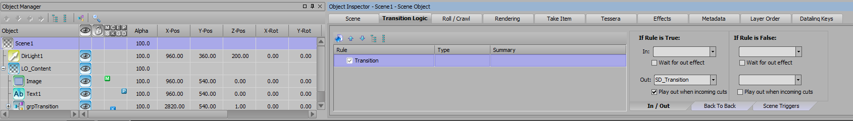 Some clarification. When putting a scene online using Transition Logic the current scene which is online will play the OUT-animation. The tricky part is that the new scene will be put online at the same time but it is hidden under the current scene which is online. Also the IN-animation will start playing immediately (unless you've checked "Wait for out-effect") So it's on the same layer, but it's under the current scene.