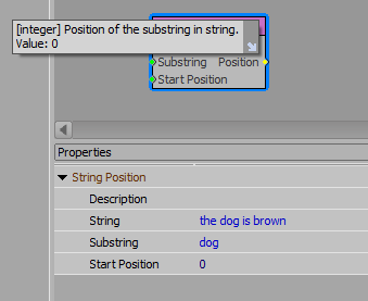 Are there any known issues with the "String Position" function inside visual logic? No matter what I do it the output is always 0. Here is a very simple example to demonstrate: say I want to find the position of the Substring dog inside of the full String the dog is brown. I expect the function to return the position 5, but the function returns 0. Am I doing something wrong? I have even tried searching for individual letters but still no luck.