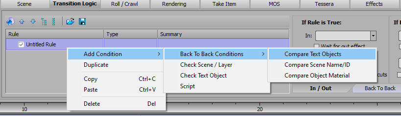 Instead of selecting a "Check Text Object" condition, there should be a Back To Back Conditions submenu that includes "Compare Text Objects." That will let you evaluate if a specific text object is the same or different between the incoming and outgoing scenes.