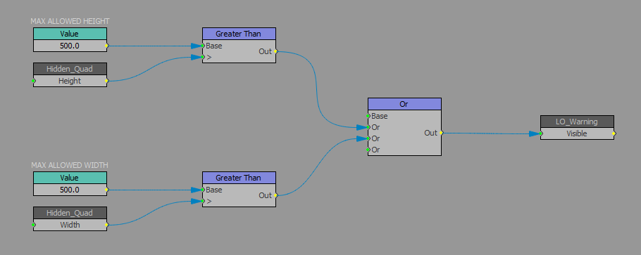 However you could also use VLogic, but theproblem is that we don't have direct access to the dimensions of the material in VLogic. So a possible workaround would be to put a secondary Quad in your scene with the same material applied to it, but you would have to set the Auto-Size property of the quad so that it resizes the Quad every time the Material is resized. i.e. every time the material changes. That secondary quad should be hidden so it's not visible but since it will adjust to the dimensions of the material, you can use the height and width of that quad to determine whether or not it's dimensions are above a specific value.