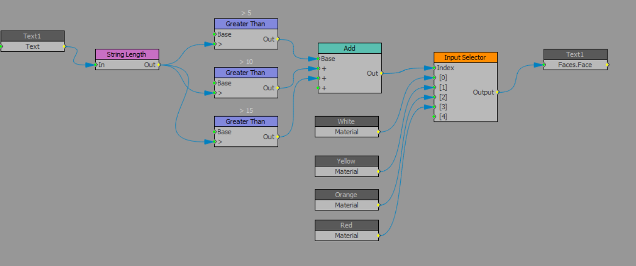 Just as a mental exercise, I tried to make a text string that would start white, change to yellow after 5 characters, orange after 10, red after 15, and stop accepting input at 20. White to yellow was easy enough. Then I thought I could use And blocks and an Input Selector to do the rest, but nothing doing. I can't even access any values of the Input Selector beyond 1 and 0. If And block returns 1, it's Material 1, and Material 0 if it returns 0. No idea how to access any values other than that.