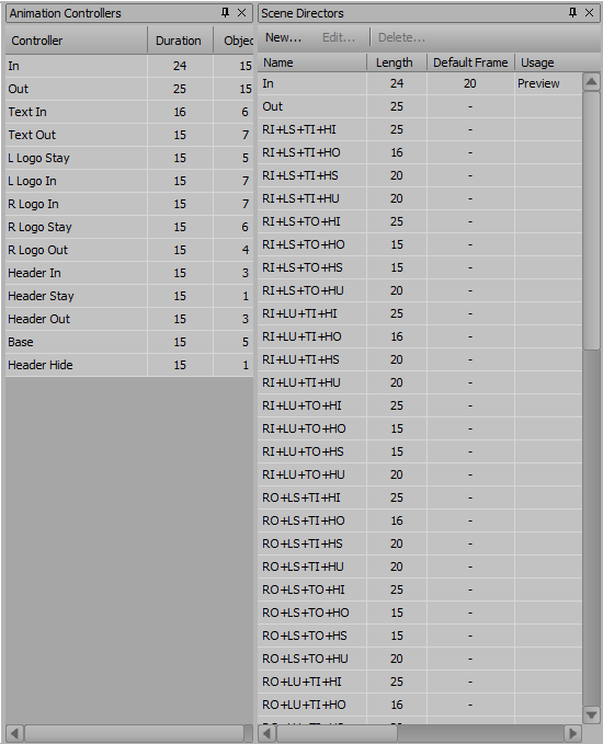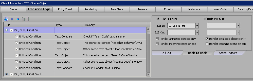 Each of the green boxes stands for an individual rule for back-to-back in/out transitions, which all contain a set of conditions. And each rule triggers in and out scene directors made up of animation controllers with the corresponding transitions for each piece.