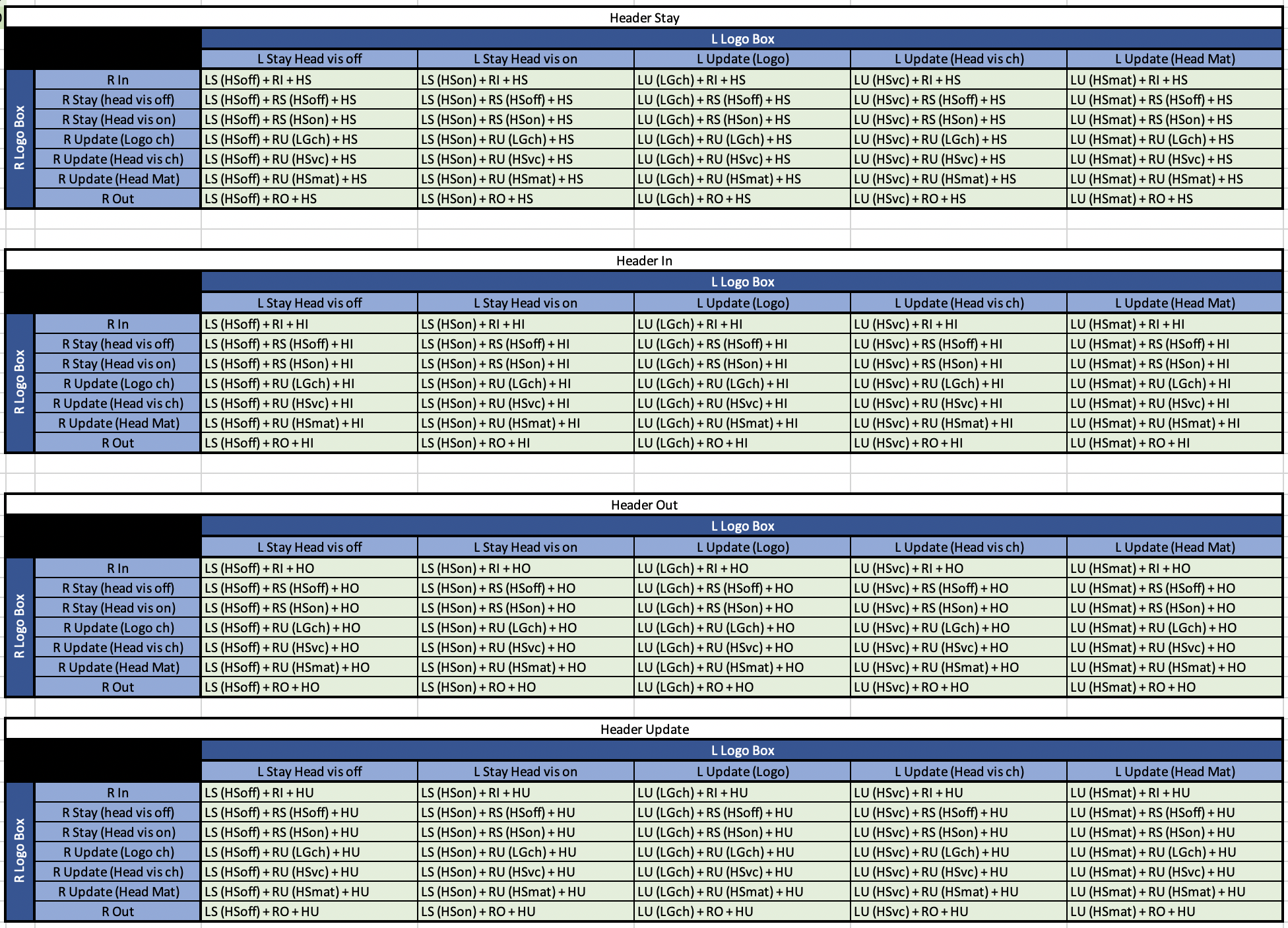 I made a worksheet in Excel for my logic to keep track of all possible states that I would need to consider with the transition logic. The logo box on the left I referred to as simply "L", the logo box on the right as "R", and the header bar as "H". So the possible changes for the header would be for it to animate in, animate out, update, or stay the same. The possible changes for R would be for the box to animate in, animate out, update due to a different logo, update due to a different headshot, update due to headshot visibility changing, stay the same with a headshot visible, and stay the same without a headshot visible. And so on. Here is my worksheet:
