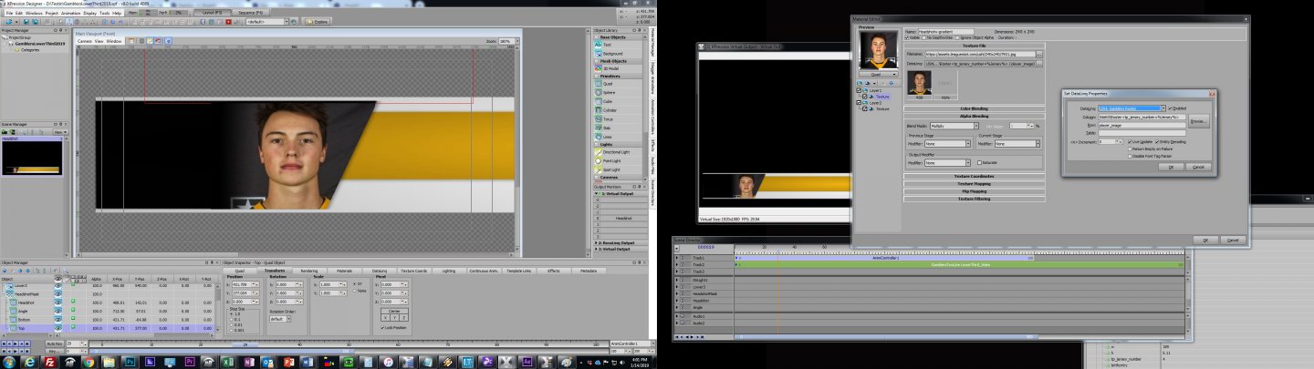 You can use Datalinq keys here. This creates what is called a volatile texture. When you datalinq an image/video to an object this new volatile texture will take on the properties of the material that is is replacing.