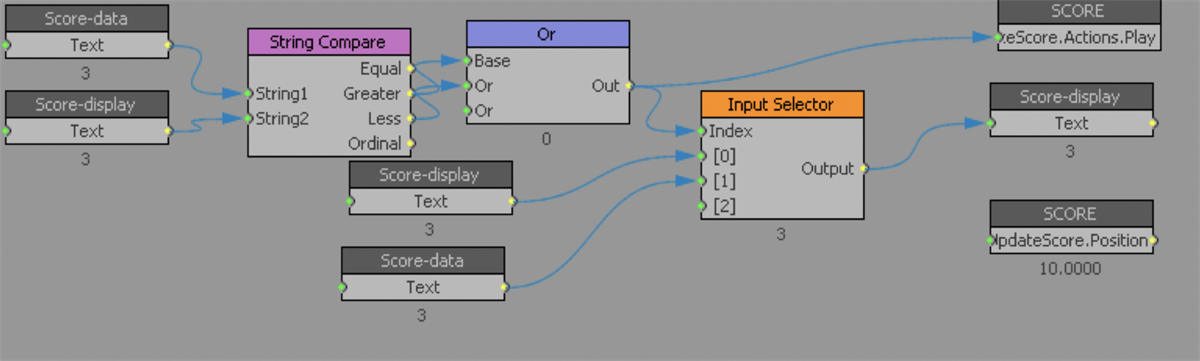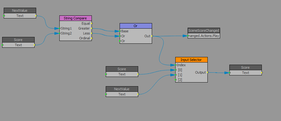 Reviving this thread, as I'm having trouble getting this to work and I'm hoping someone can help me out. I've got a scene that has 2 text objects: Score-data is pulling a score from a widget (will be Datalinq eventually, testing with a widget though), and is hidden. Score-display is what shows. I have a scene director titled UpdateScore that I want to run, and it simply does opacity 100% to 0% over 7 frames, then 0% to 100% over 7 frames. I want the old score to update at the mid point (7 frames) when the text is hidden. I'm trying to use the Visual Logic example above, but I cannot get this to work, and I can't figure out why. I've changed the scene director to only do the 0% to 100% opacity, and I've seen it work once, but then it doesn't work further. I tried adjusting the Scene Director position to 0, to no avail.