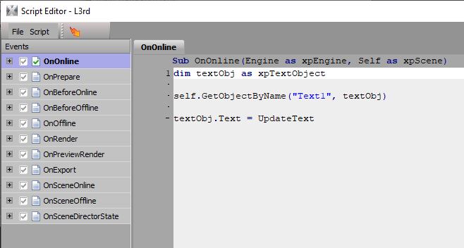 The L3rd scene utilizes the UpdateText function to change a text objects text when the scene comes online
