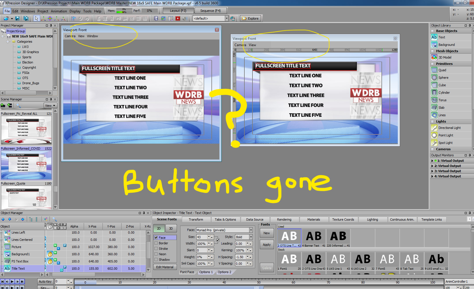 However, I then couldn't get the main viewport to live on the main XPression layout, it would fall behind on its own every time I clicked the layout area. I then realized the main viewport had been set to floating. Unchecked that, and then all was back to normal.