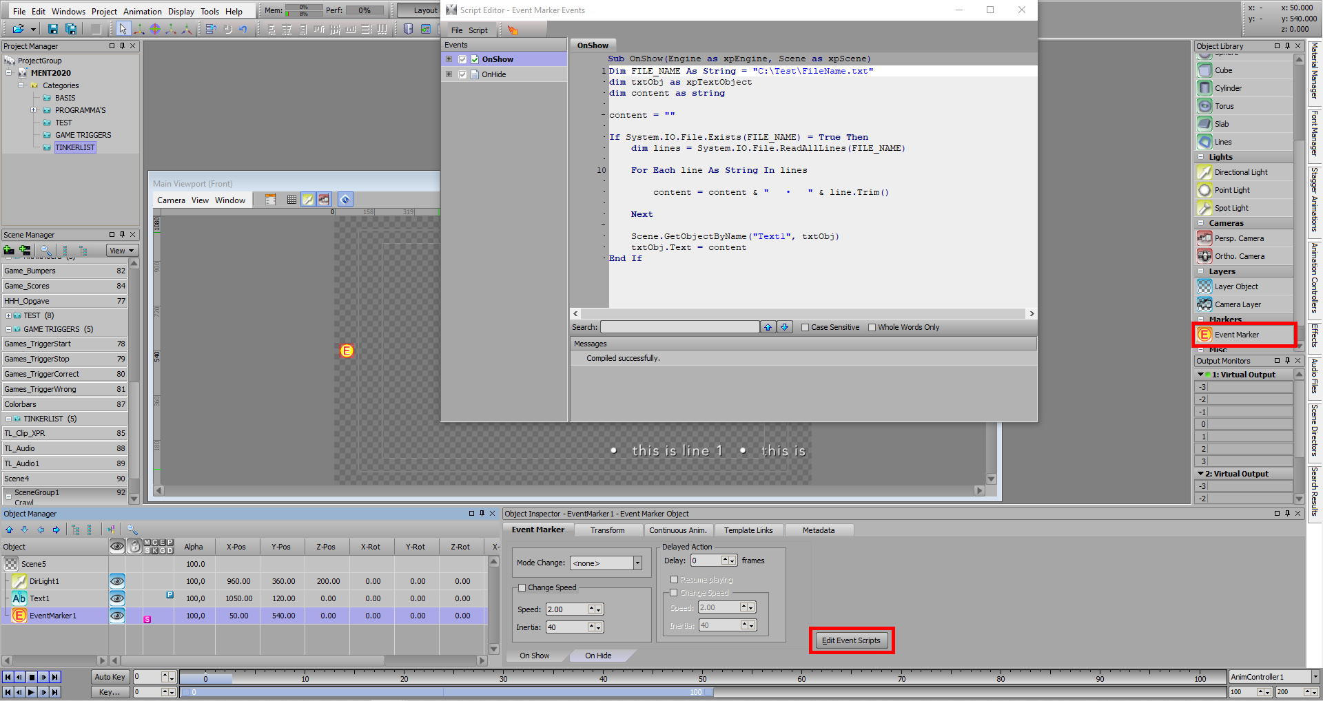 There is only one exception to this and that is to put the Script in the OnRender-tab of the scene. But that means that the script will be triggered every frame. So trying to read 1000 lines and placing them in a textobject is DEFINITELY going to have an impact on the performance.