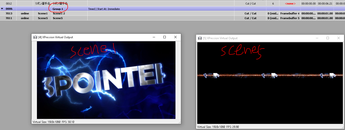 I put those scenes in different virtual output and group them up to try to play them on air together.