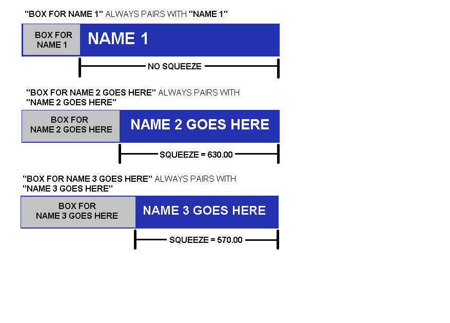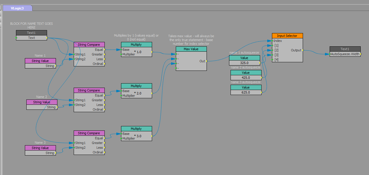 Hello all. I would appreciate any help with this issue. I would like the Auto Squeeze for a text (person's name) to adjust depending on which name is entered. I have different lower thirds that have an image tied to a person's name. If person one's name is used, image 1 is used. Different names have different sized images. Right now, the majority of the names will not require Auto Squeeze. Of the other names, I need 3 different values, 625.00, 580.00 and 575.00. I think I'm close to figuring it out with Visual Logic using String Values and value inputs for the Auto Squeeze Width, but I need help. This is an example of what I'm trying to do: