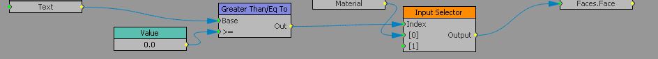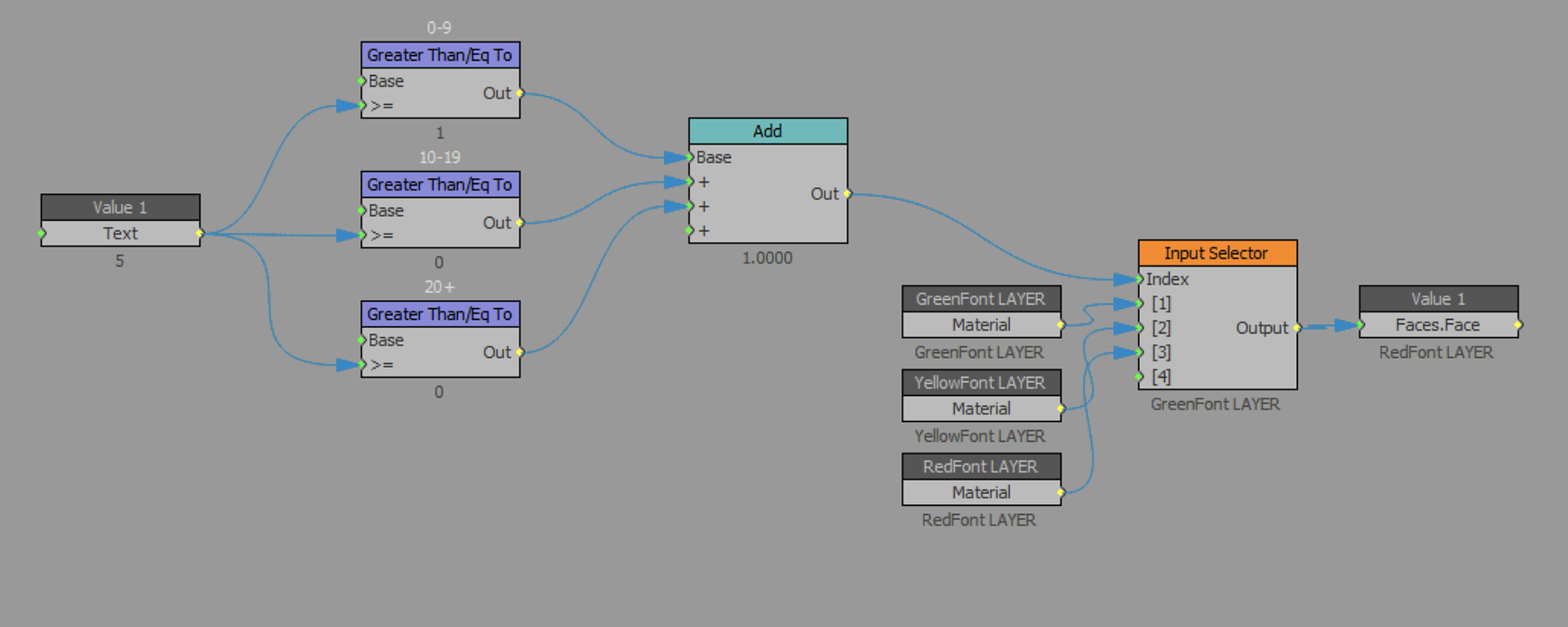 Is this text value greater than zero? True (1), is the text value also greater than 10? True (1), is the text value also greater than 25? True (1), add all of these conditions together which makes a total of 3. Feed that 3 into the index of an input selector, an index of 3 is set to the red material. Make the face of the object's material red.