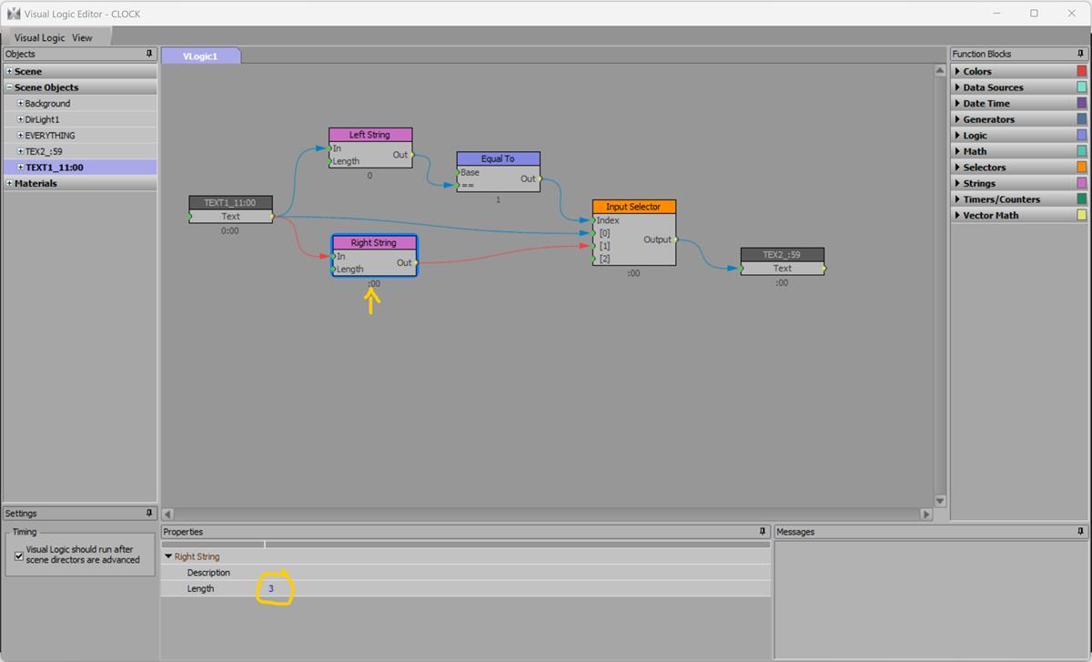 My original timer is set for 11 minutes, and it counts down. For some reason, when I connect my "Output" from the Input Selector to "TEXT1 or 2", the numbers disappear. If I change my Index Offset to 1 from the Input Selector properties, the text returns, but does not hide the ZERO.