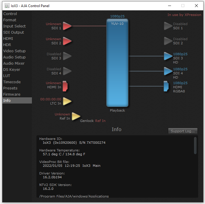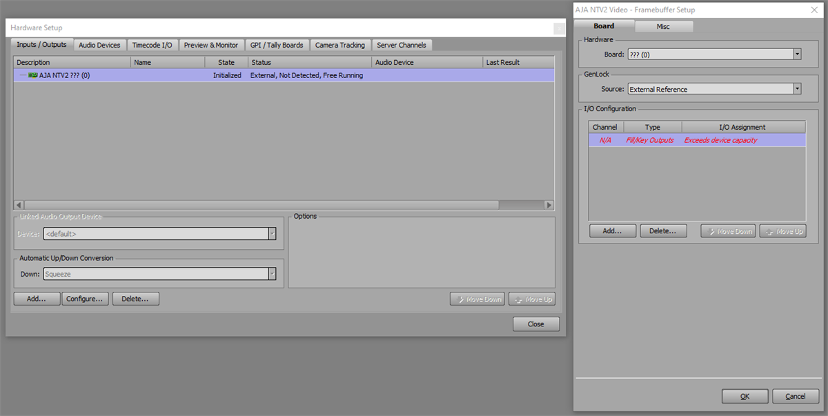 I have the new AJA IO X3 along with the AJA software v16.2 & ntv2driver-16.2.0.194-Beta1. I can connect the AJA box to my laptop and the AJA software absolutely fine but when I try and connect to XPression, It seems to not recognise the board (???(0)) and comes up with the message "exceeds device capacity" when adding IO. Has anyone else experienced similar issues?