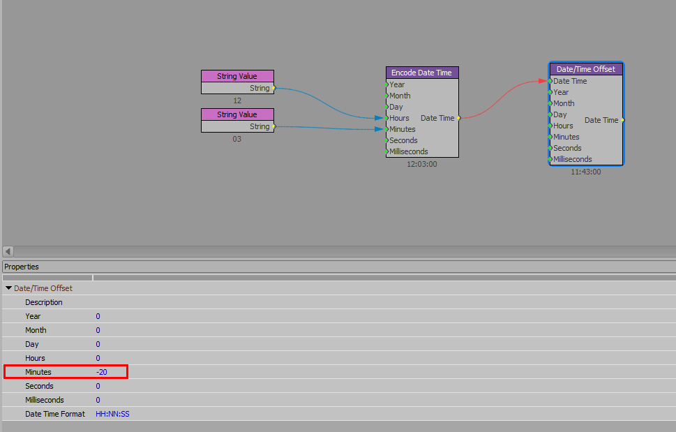 That Date Time-object is then fed into the Date/Time Offset-block in which I have specified a negative 20 in the minutes so it effectively subtracts 20 minutes from the original time provided.