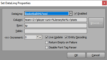 Here is a screen shot of my feed using Datalinq key to populate Total Points from a stat crew file.
