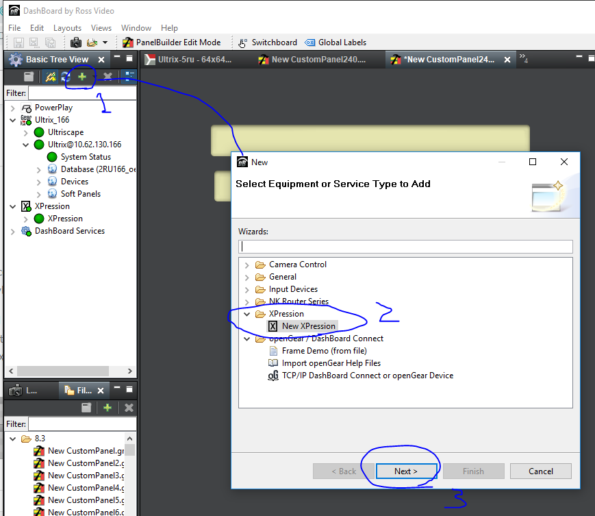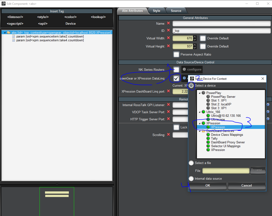 Find where it says "openGear or XPression datalinq". Check that box, and the configure screen should appear. Select "select a device" radio button, and select your XPression from the list: