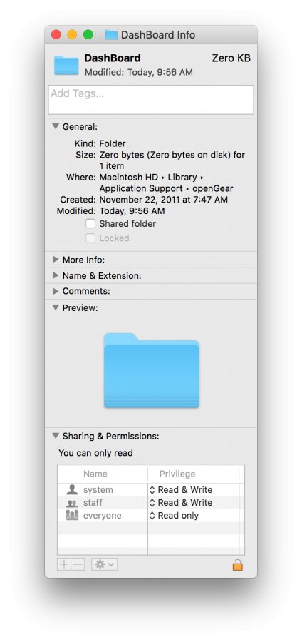 Can you please post the permissions listed for the directory [I] /Library/Application Support/openGear/DashBoard/.metadata [/I]?