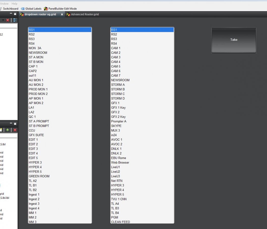 I'm including a fairly simple panel to help get you started. This panel reads the list of sources and destinations from an Ultrix (you'll want to use the "Data Sources" button on the PanelBuilder tool bar to associate it with your Ultrix) and allows you to set crosspoints on each one.