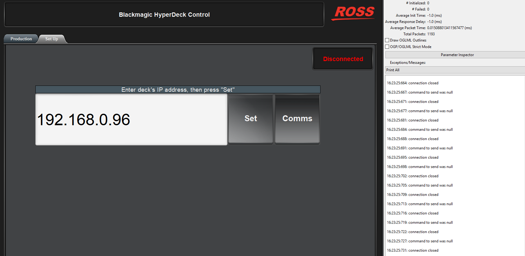 The "send command" is set to null once the clip list fetch has been started. The fact that it is constantly connecting/disconnecting without any messages coming in has me suspecting that there is an issue with the port on the Hyperdeck side. To be sure, you may want to wrap the listener code in a try { .... } catch (e) { ogscript.debug('EXCEPTION: ' + e); } to see if there is another hidden error that is being missed.