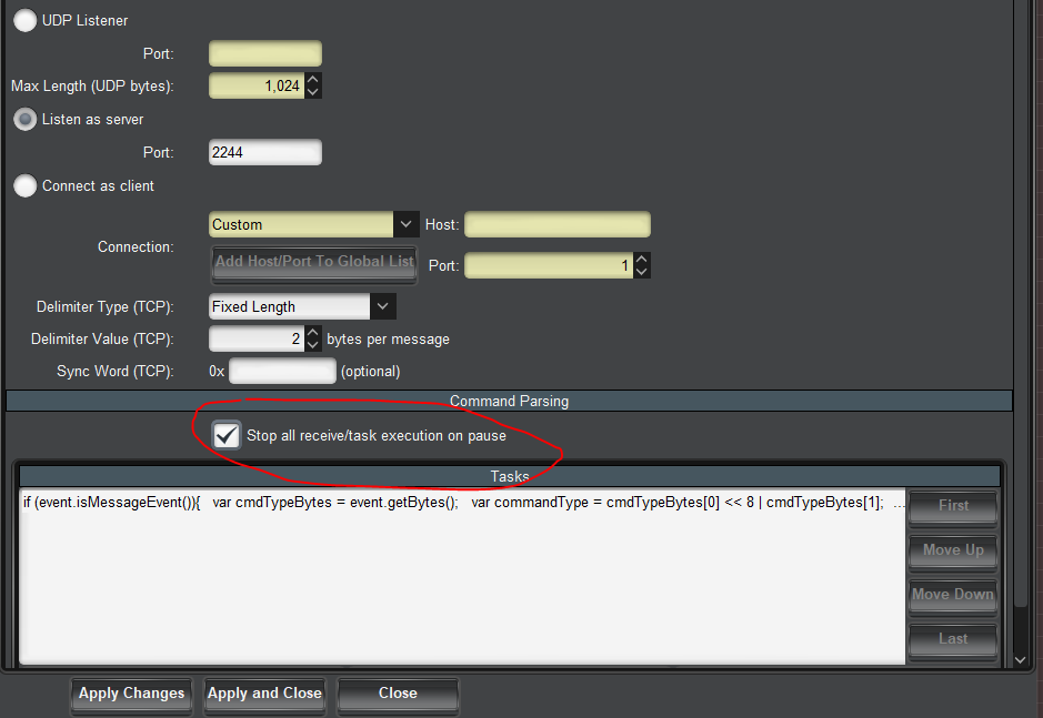 Listener is triggered via listener.start button. Yes its starts and i got bytes back from server while using fixed length (1) delimiter - actually, i just collect it byte by byte and write to parameter: