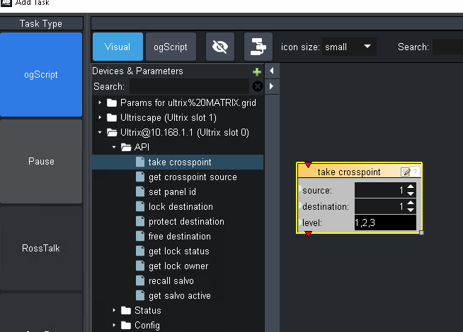 <block id="1016" type="Ultrix.1_ultix_takecrosspoint" x="259" y="168" w="243" SRC="1" DEST="8" LEVEL="1,2,3" />