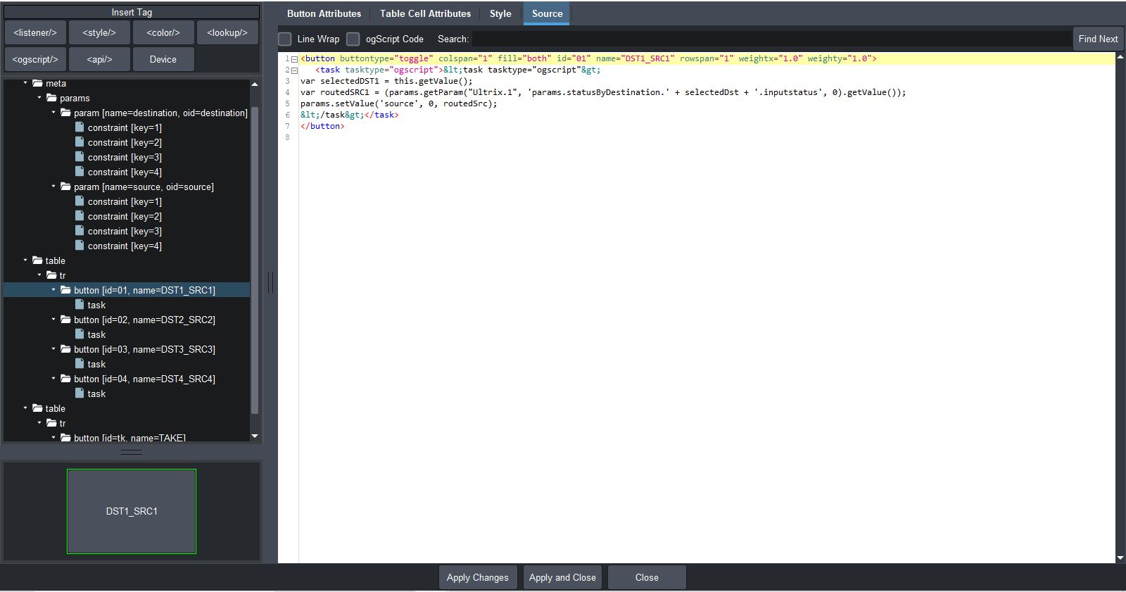 <button buttontype="push" colspan="1" fill="both" height="149" id="09" name="SRC1_DST10" rowspan="1" style="font:bold;size:Big;" weightx="1.0" weighty="1.0" width="158">