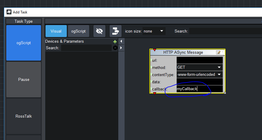 You can write the name of a function in the callback field of visual logic blocks.