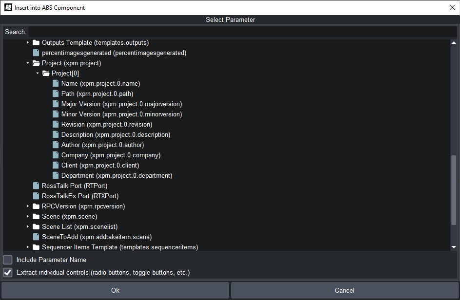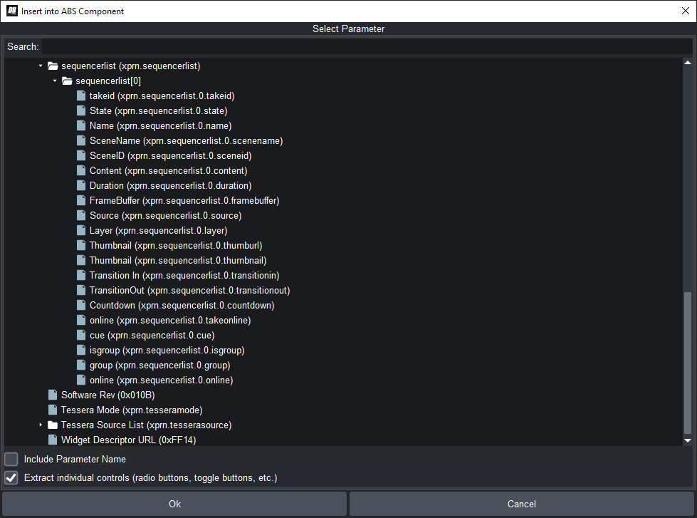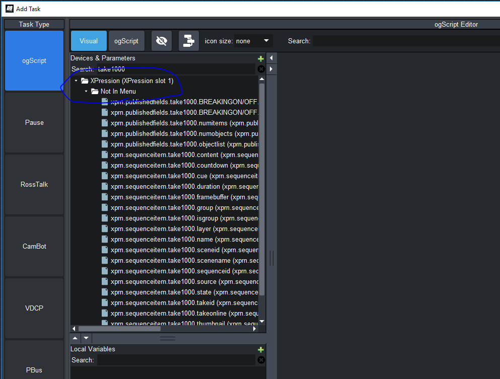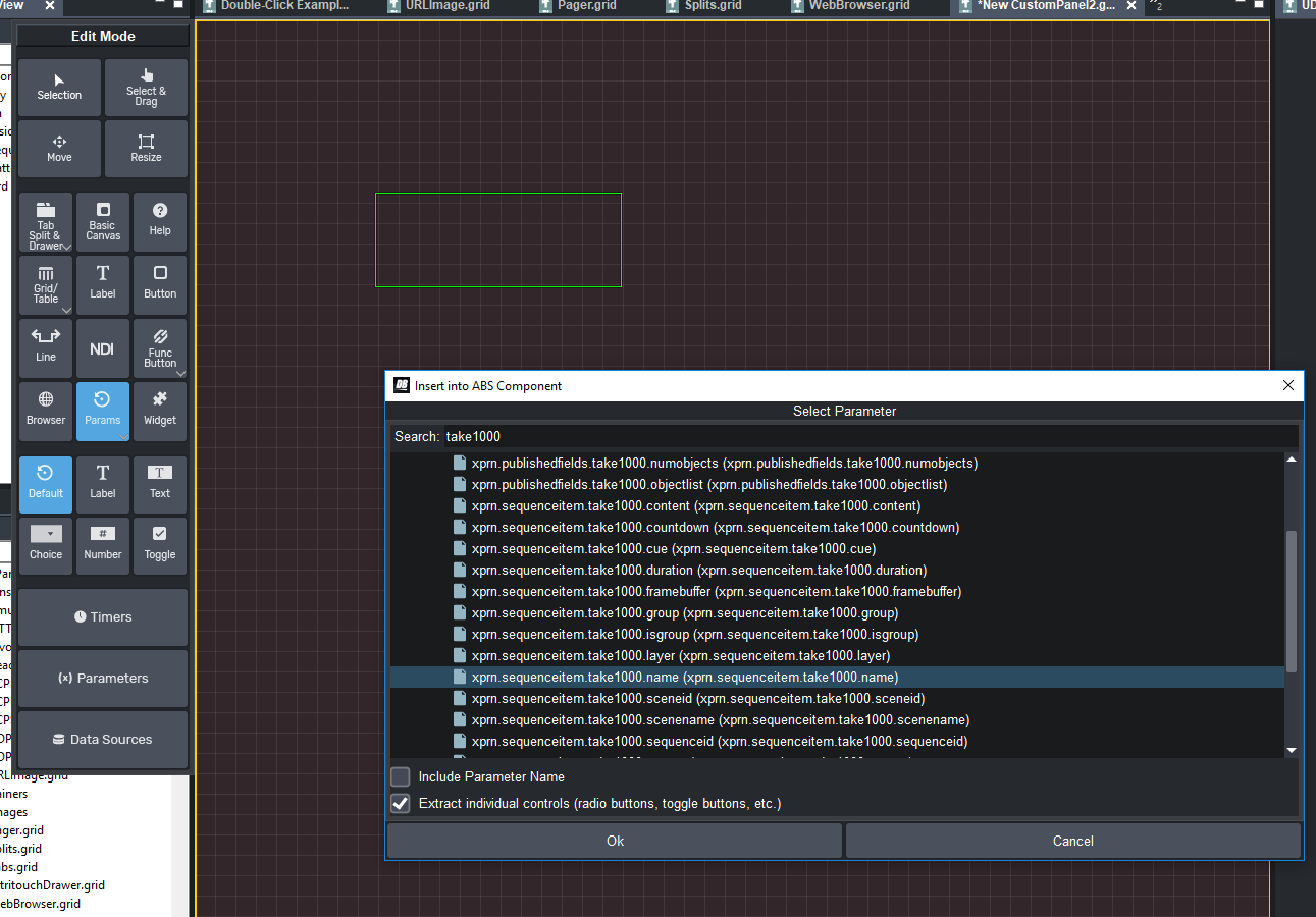 5. If you click on "Parameters", and drop a "Default" parameter, you will get a list of all the parameters that your panel knows about. Including all the XP ones. It's easiest to search by TakeID. If you want something about take 1000, type "take1000" in the search bar at the top. You will see all the parameters about take 1000. There are some about the published fields, and there is information about that take item.
