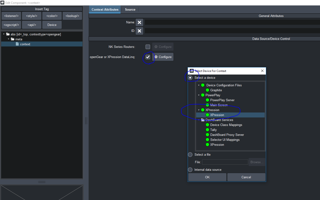3. Check the "OpenGear or XPression Datalinq" button, in the popup, select the "Select a Device" radio button, and select your XPression: