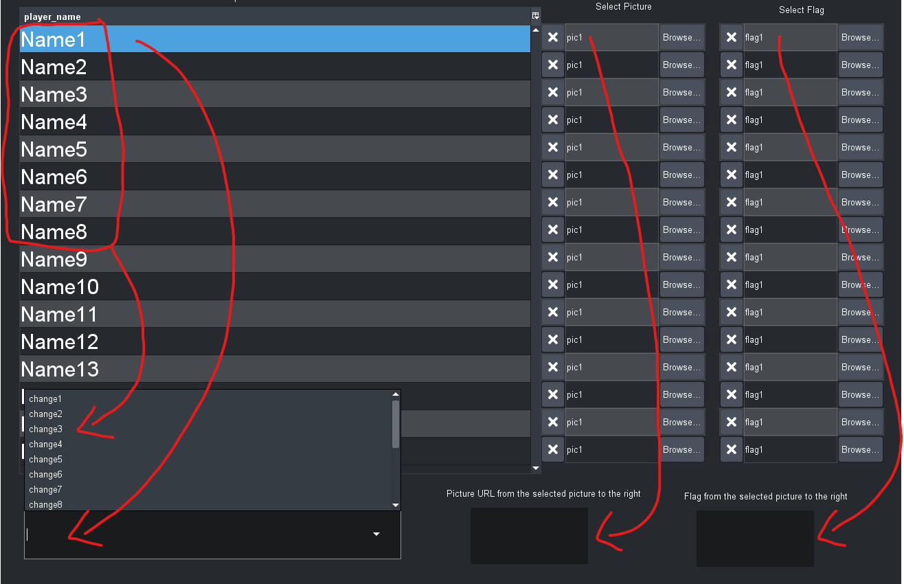 Then when I select the name in the new dropdown list, the picture and the flag url should populate two new parameters.