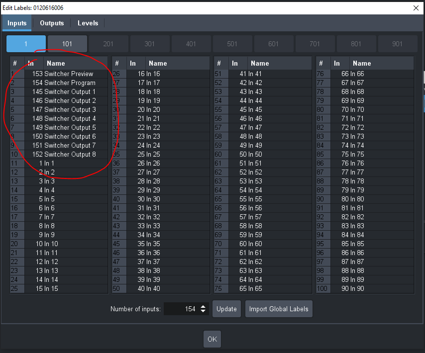 I need to be able to switch one particular destination from input 8 to 46 and back again when needed. I want to put these changes in two custom controls, but I cannot access Inputs 0-9, which align with the switcher outputs, specifically Preview, Main and the 8 AUX's.