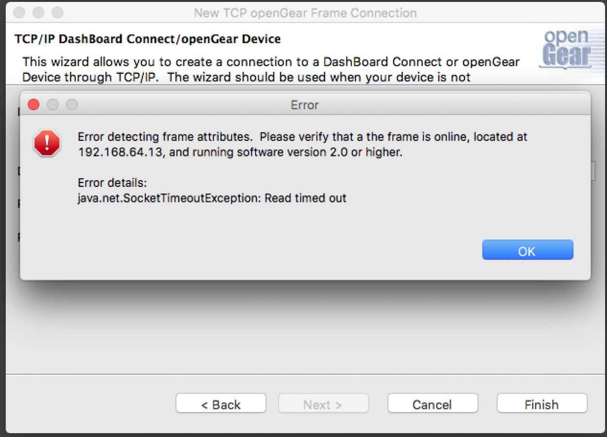 We have a new Carbonite Black with a 2ME panel but I cannot connect to the frame in Dashboard. I can see the panel and control the other 2 switchers on the network but if I try to put the frame in, I get a java timeout error. Any Ideas?