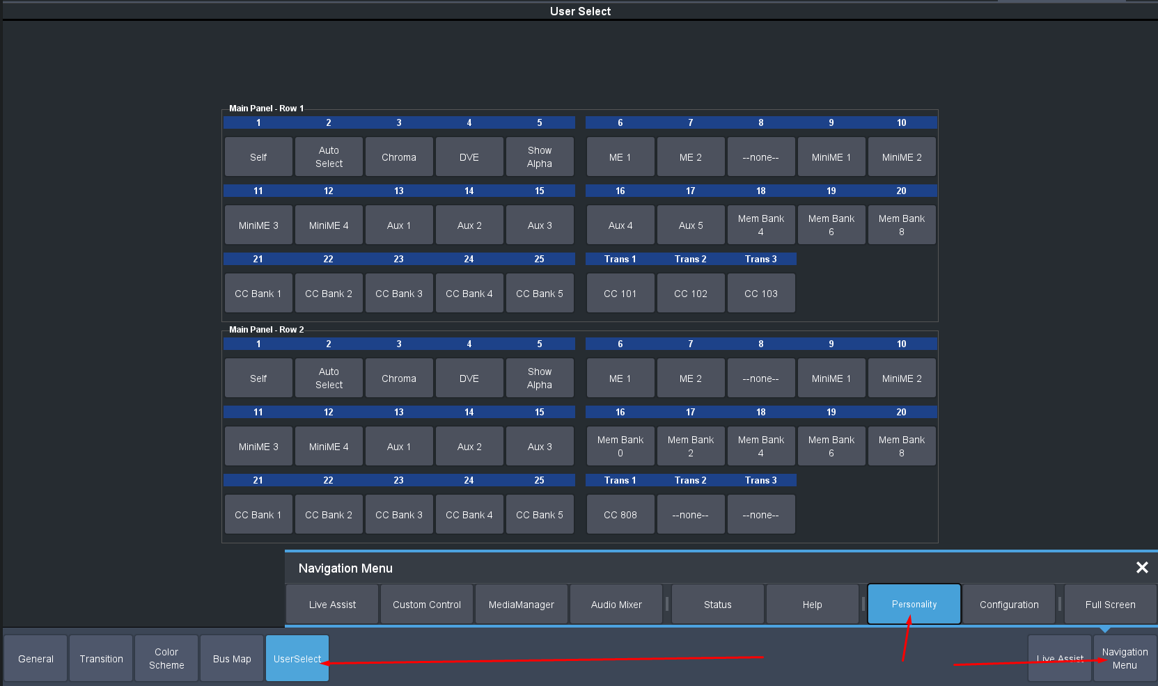 On the panel MiniMenu .. press the Menu Button - Then select the User Menu - press next the first Knob should now be the User Sel Buttons menu. Click on the knob to enter the menu