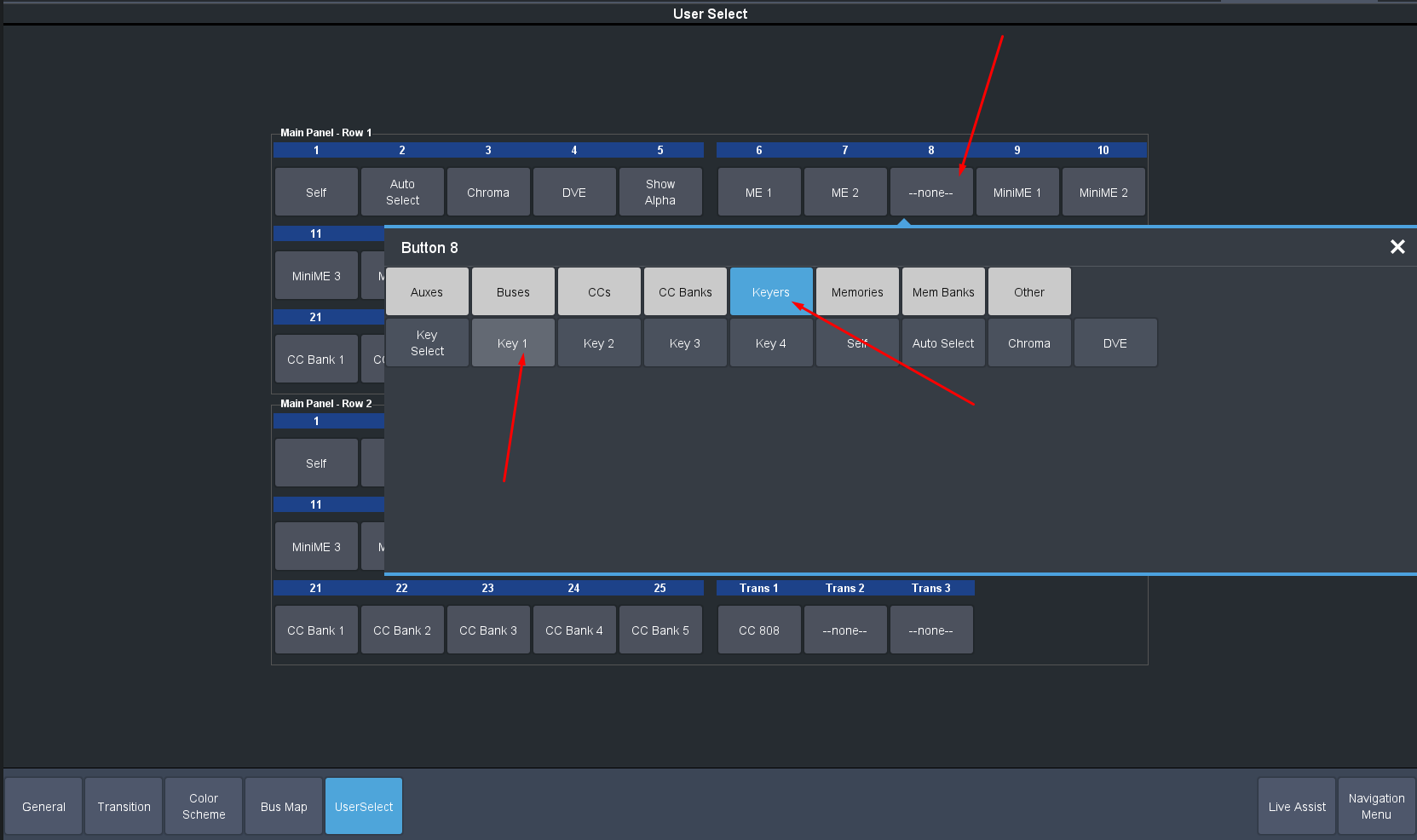 First Knob is the Row/Button to select, then the middle you set to KEY for the type .. Then the third Knob is the Index for selecting the Key Number or the "Select" mode where you hold the button and then the Bus changes to allow you to select the keyer via the Keybus deletgation row (for smaller panels like the CB-9 where you want more buttons available.)