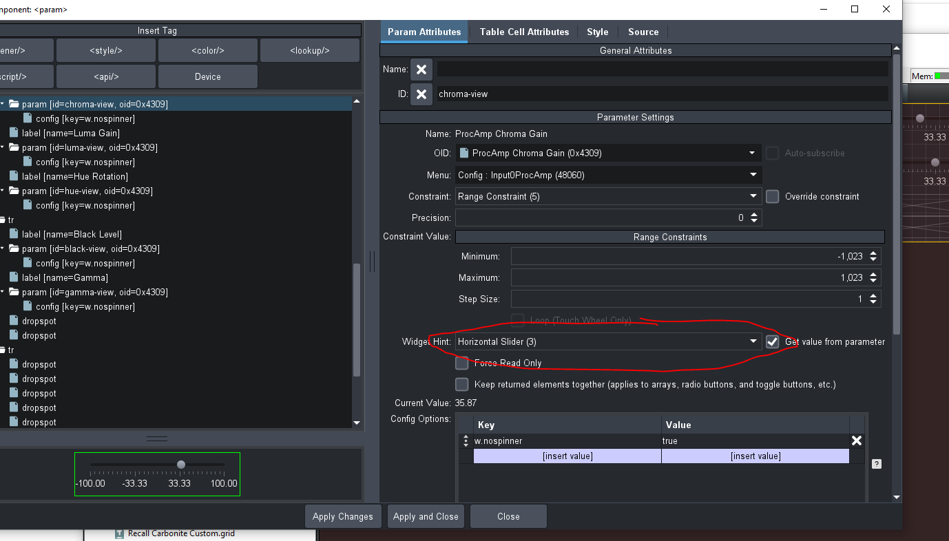 Once you have the OIDs, you can create a new custom panel, set the Carbonite as its data source, and add the ProcAmp parameters to it. Since you are adding the parameters directly (instead of through the drag/drop of Carbonite's widgets), you will be able to override their widget hints and change the slider from vertical to horizontal: