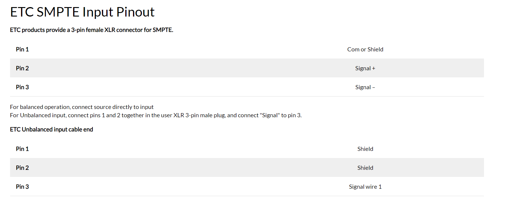 Trying to figure out how to wire XLR pinout to Weco connector for LTC input on Carbonite Ultra. The manual shows the 3 connectors on the Weco as LTC-, LTC+, LTC-. How does that translate to the XLR cable pinout? Thanks.