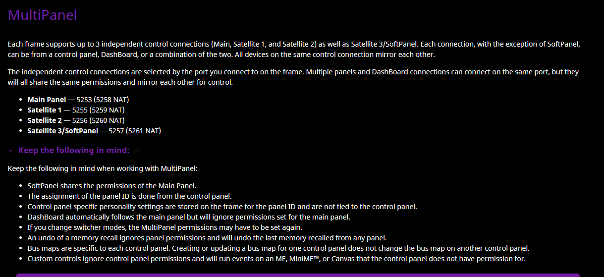 A few years ago Carbonite Ultra upgrade moved the SoftPanel to it's own dedicated connection. When the TouchDrive Panels were introduced the need to be able to have multiple panels with independent DashBoard Connections was needed. Each Panel requires a separate connection for Main / Sat 1 / Sat 2 / SoftPanel. This way each instance of DashBoard is able to connect to it's own port and have it's own LiveAssist Follows and Custom Control Editing.