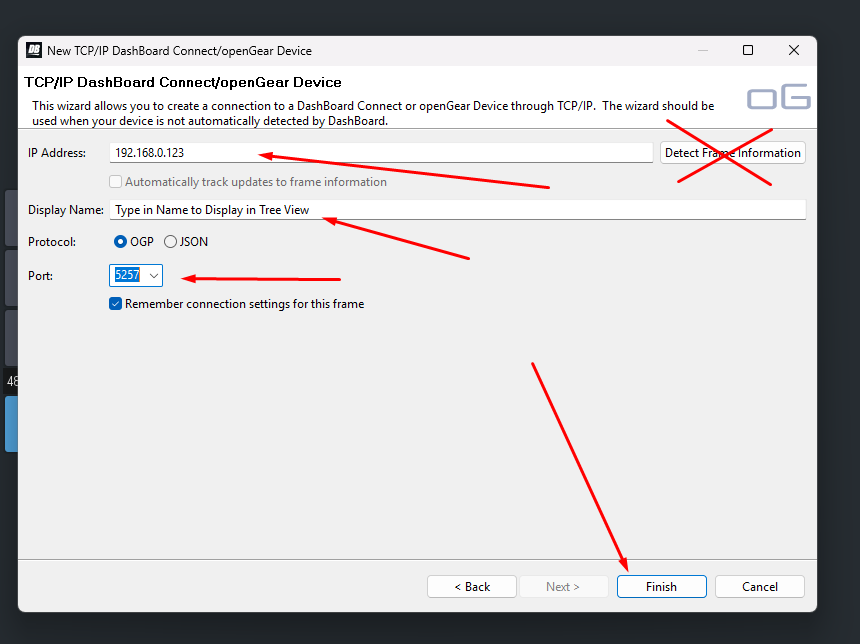 Enter IP Address of the Ultra Frame - DO NOT use the Detect Frame Information button as that will always connect to the 5253 MAIN PANEL port.