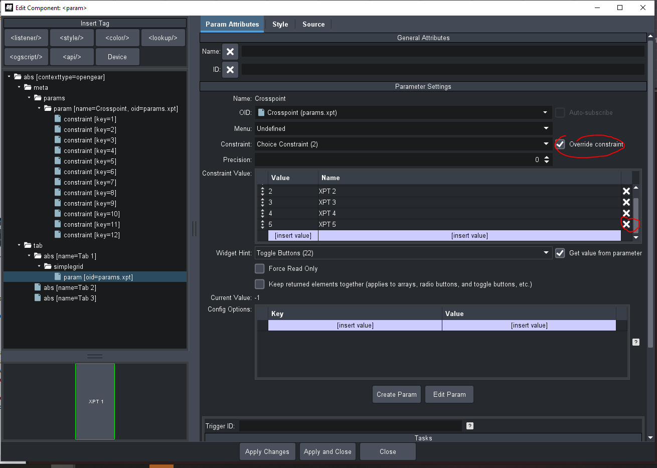 I'm creating a custom panel to control my switcher from my Ultritouch 2. Because of the size of the UT2, I've got my crosspoint buttons split between 4 tabs. I'm doing this by having individual parameters for each tab. This works fine, but as I switch tabs I see a different crosspoint selected from the last time I was on that page. I'd prefer to have a single parameter with all of the choice constraints in the setup, then choose which choice is visible in each tab. So I'd only be editing the one parameter, but my tab dictates which changes I can make. Then if I have a value for the parameter that isn't on the tab, it just shows no selection until I hit the next value.