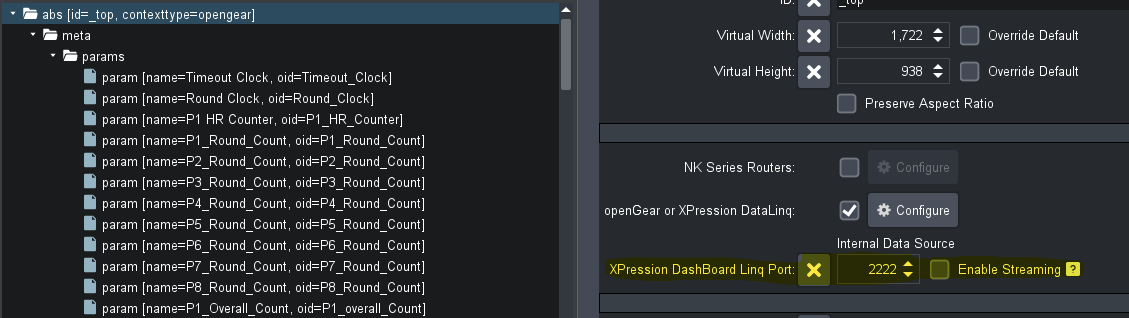 Open up the base Abs of the dashboard panel (You can open up any element, then use the slider on the left hand pane to go all the way to the top and see abs). From there, you should see the option for XPression Dashboard Linq Port, and more importantly, an "Enable Streaming" checkbox. Make sure that's checked, and then make sure that's the only panel open streaming on that port. (Or change the port on both the dashboard and the datalinq if you need more than one on the same computer)