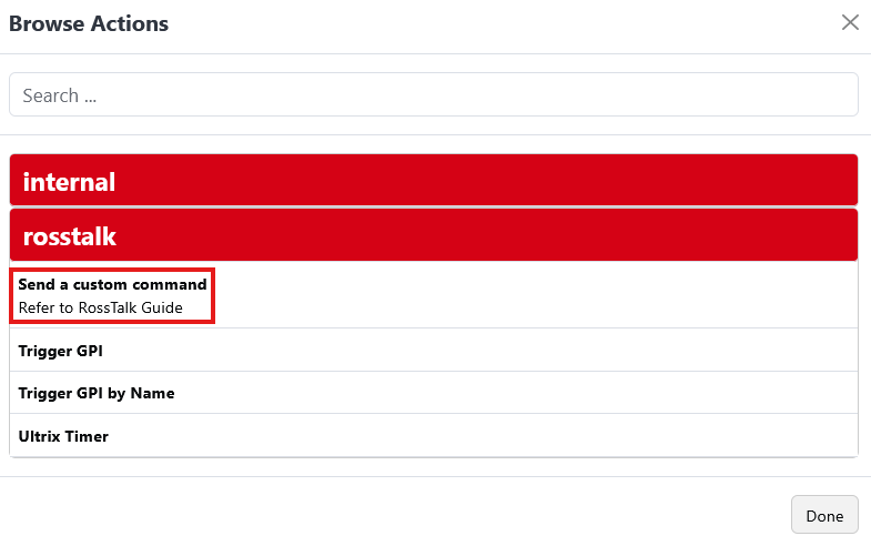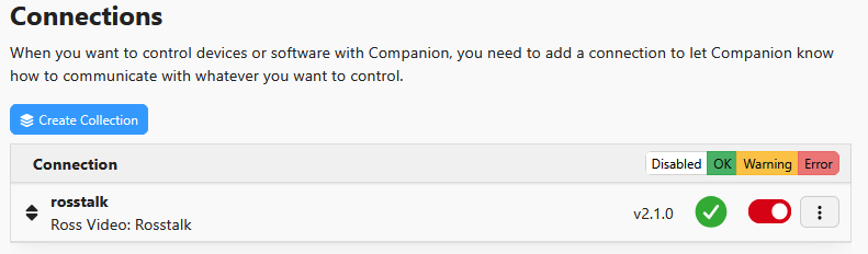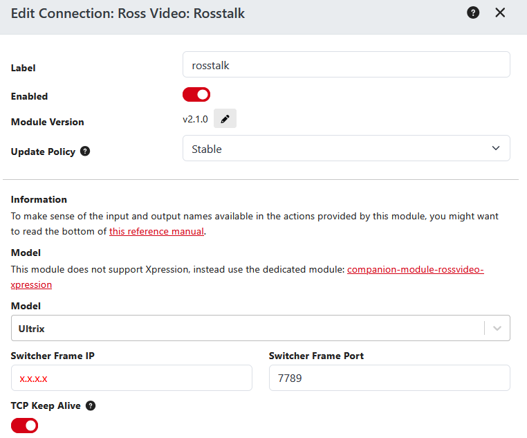 In Companion, I used the Ross Video: RossTalk connection. Make sure your IP is set for the machine hosting Dashboard. If the machine is also hosting other Ross software (such as XPression), I would also change the port to something other than 7788. In my example, I used 7789 (I generally will use a different port for each panel regardless). For the 'model', you can technically use any of them since it's all RossTalk. All it changes are the preset commands you can choose from, however we will be using the Custom Command option available on every model. In my example, I used the Ultrix model to show that it shouldn't matter.